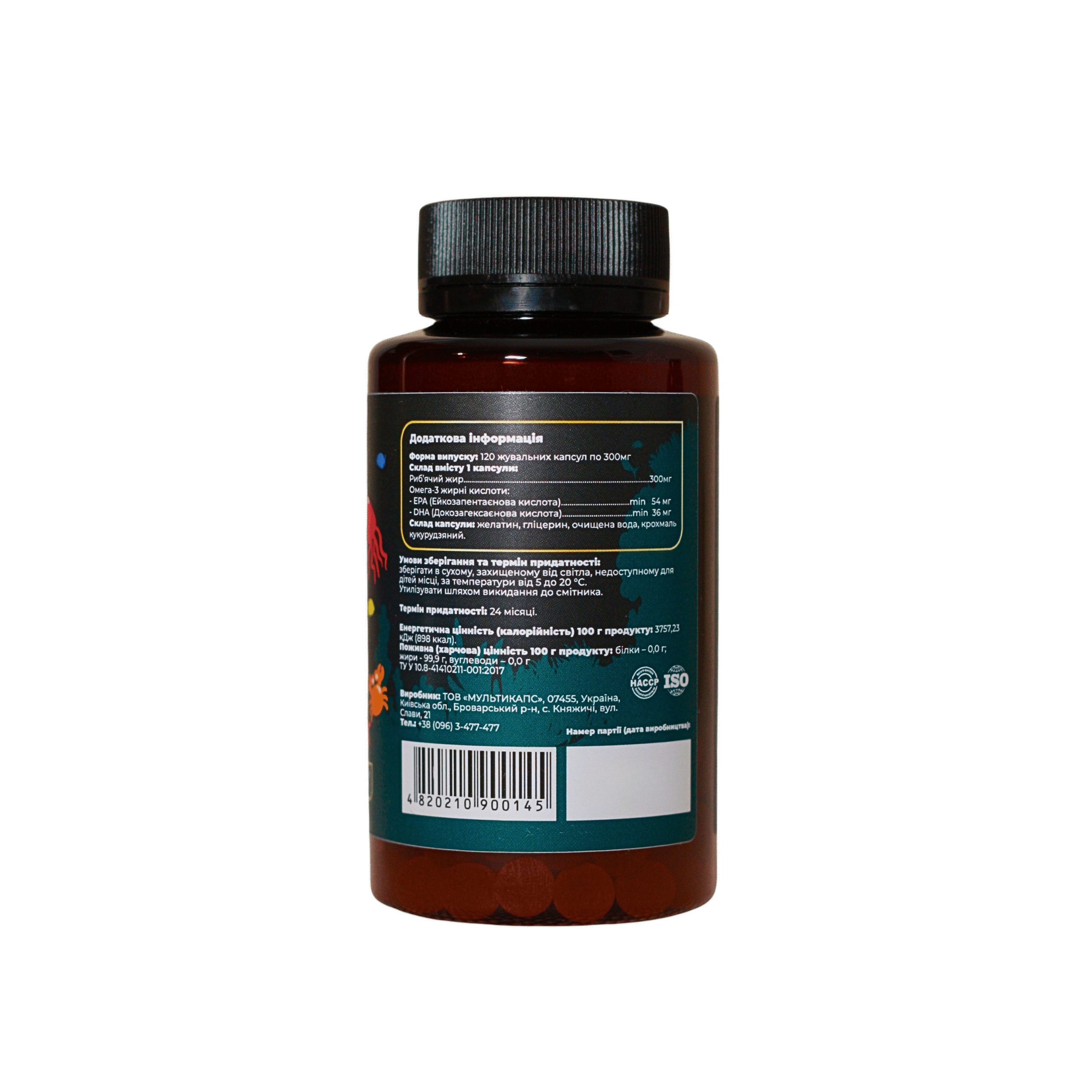 Склад: очищений риб’ячий жир, країна походження сировини: Ісландія, желатин (Франція), гліцерин (Німеччина), підготовлена вода.