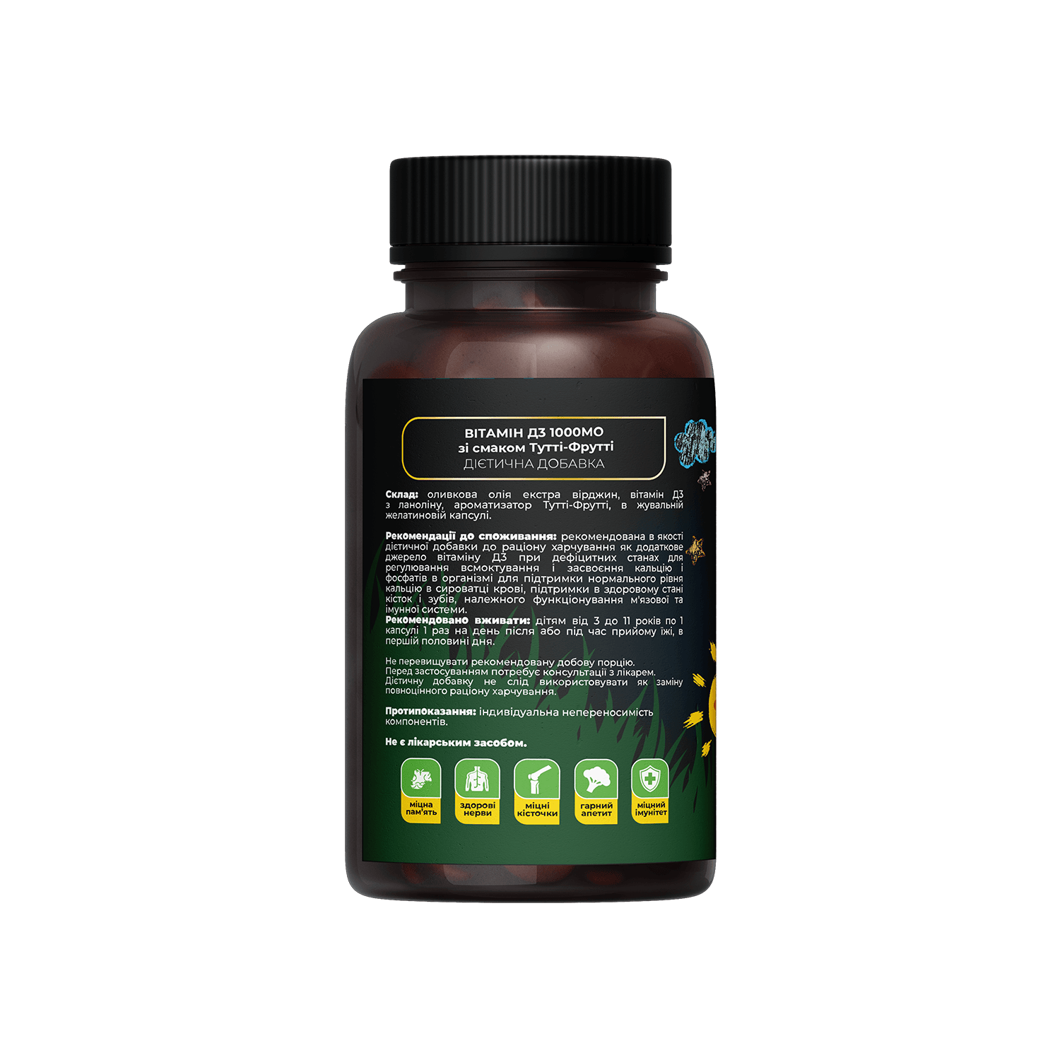 Оливковое масло экстра вирджин, витамин Д3 (холекальциферол) DSM Nutritional Products, Швейцария, желатин, глицерин, подготовленная вода, пищевой ароматизатор Тутти-Фрутти.
